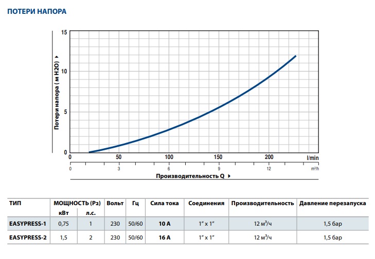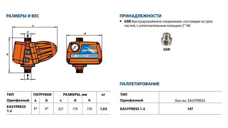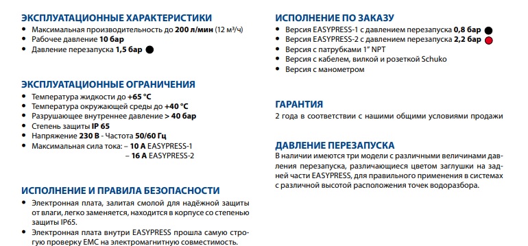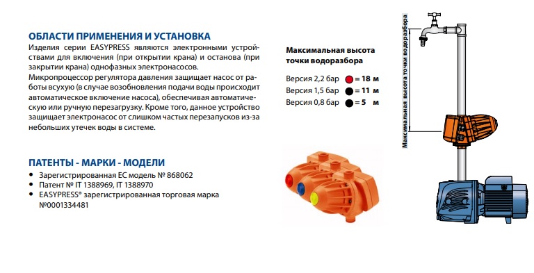 Изделия серии Pedrollo EASYPRESS 2 M (1.5 kw) являются электронными устройствами для запуска (при открытии крана) и остановки (при закрытии крана) однофазных электронасос. Микропроцессор регулятора давления защищает насос от работы всухую (при поступлении воды происходит автоматический запуск насоса), обеспечивая автоматическую или ручную перезагрузку. Кроме того защищает электронасос от слишком частых запусков из-за небольших утечек в системе.