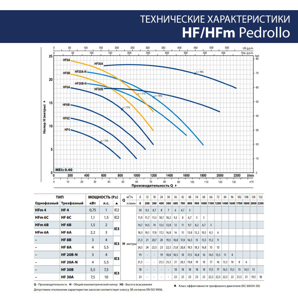 Центробежный трехфазный электронасос Pedrollo HF 20A T - рекомендуются для применения в коммунальном секторе и в сельском хозяйстве. Высокая эффективность и возможность эксплуатации в длительном непрерывном режиме работы позволяют успешно использовать эти насосы для орошения затоплением и дождеванием, для забора воды из озер, рек и скважин, а также в целом ряде различных промышленных применений, где необходима высокая производительность при относительно невысоком напоре. Установка насоса должна производиться в закрытых помещениях или в местах, защищенных от непогоды.