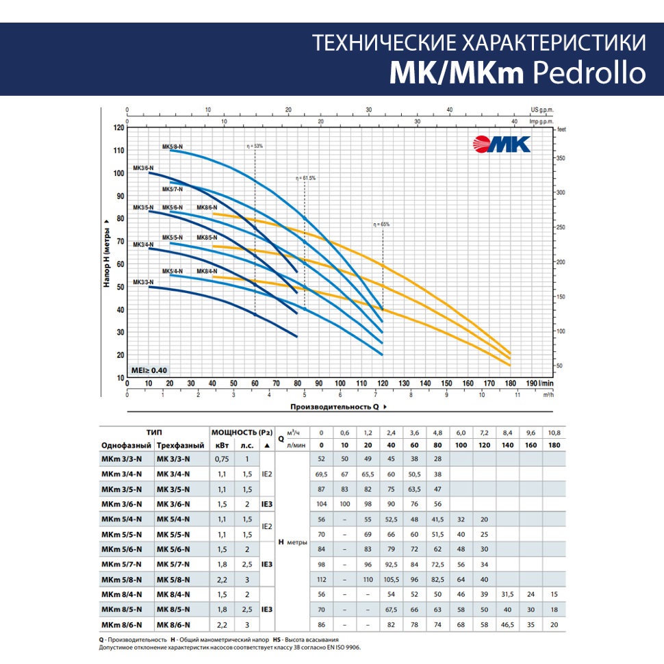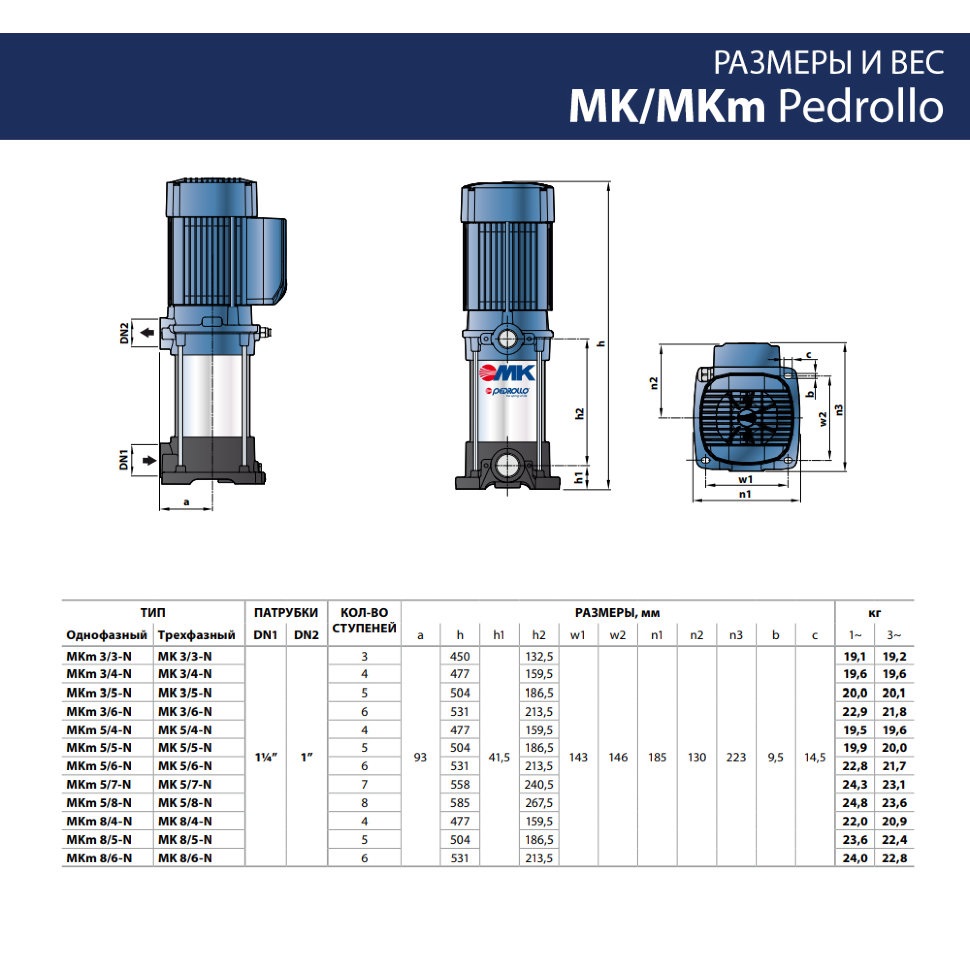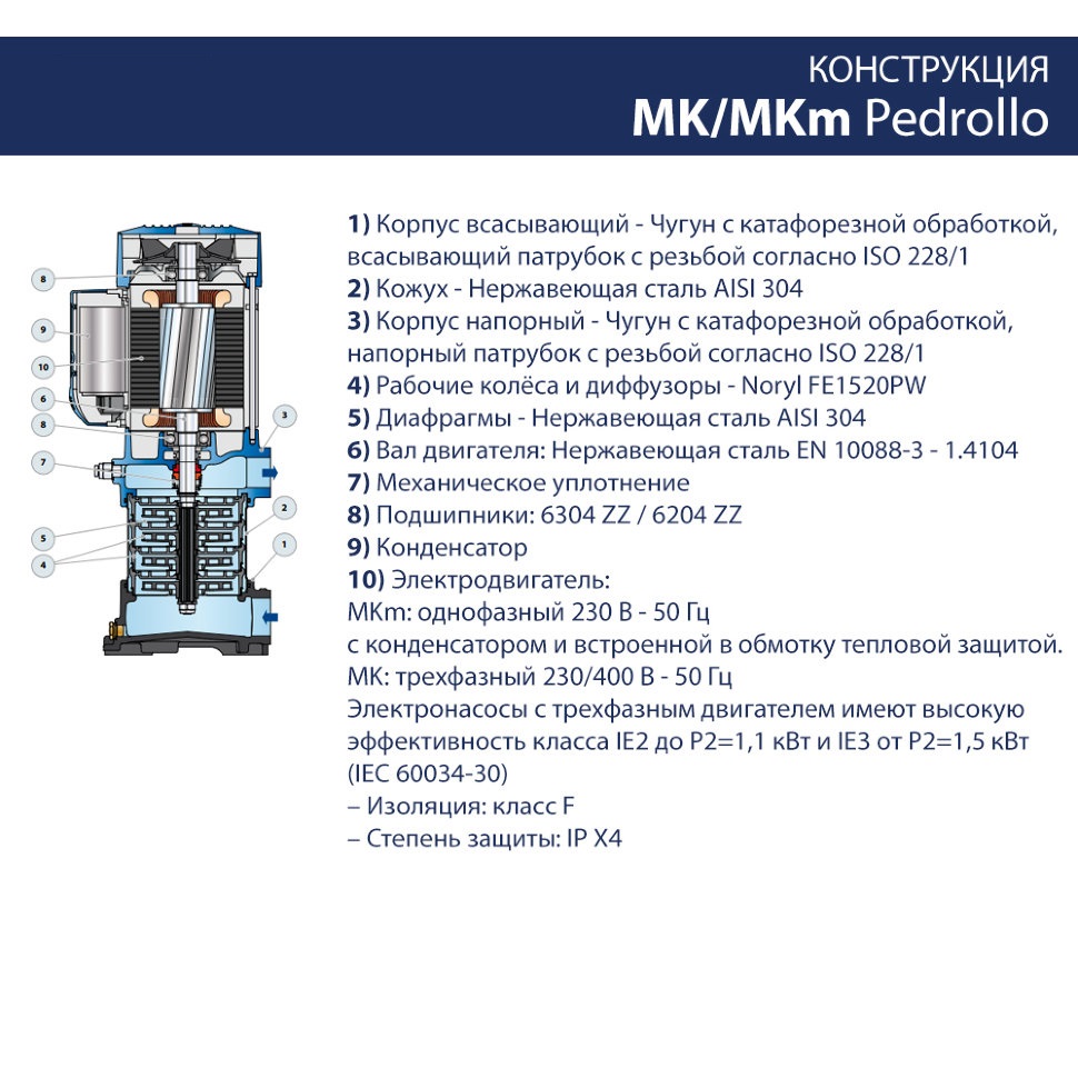 Вертикальный многоступенчатый однофазный насос Pedrollo MKm8/6 - N T - Рекомендуются для перекачивания чистой воды и жидкостей, химически неагрессивных по отношению к конструкционным материалам насоса. Высокие эксплуатационные данные и адаптивность насосов делают их идеальным выбором для применения в бытовом секторе, коммунальном секторе и в промышленности, в частности, для автоматической подачи воды в комплекте с гидроаккумуляторами, для повышения давления в водопроводной сети. Установка насоса должна производиться в закрытых помещениях или в местах, защищенных от непогоды.