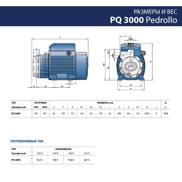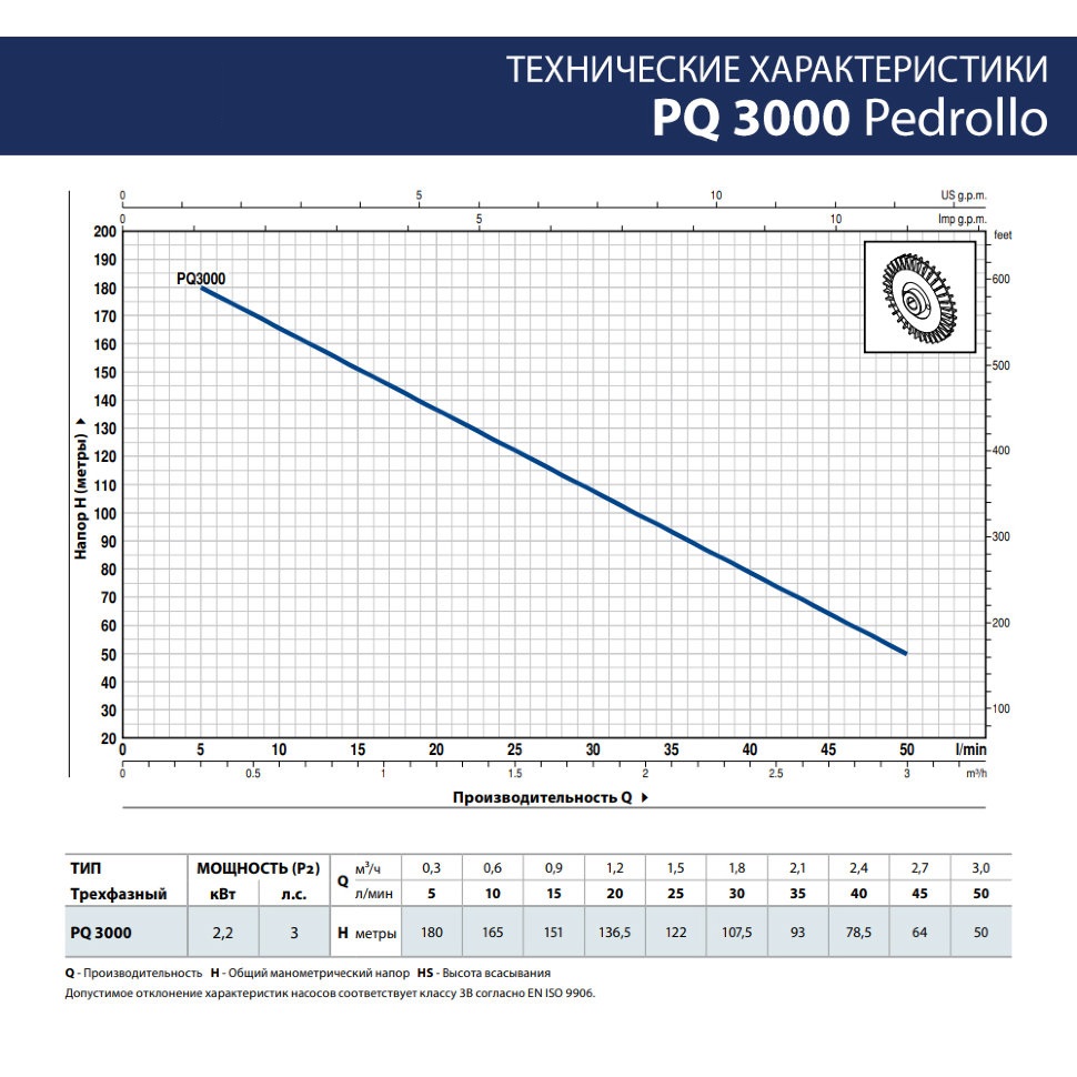 Центробежный трехфазный вихревой насос Pedrollo PQ3000 T - Рекомендуется для перекачивания чистой, без абразивных частиц, воды и жидкостей, химически неагрессивных по отношению к конструкционным материалам насоса. Гидравлические характеристики насоса позволяют использовать его в промышленности. Установка насоса должна производиться в закрытых помещениях или в местах, защищенных от непогоды.