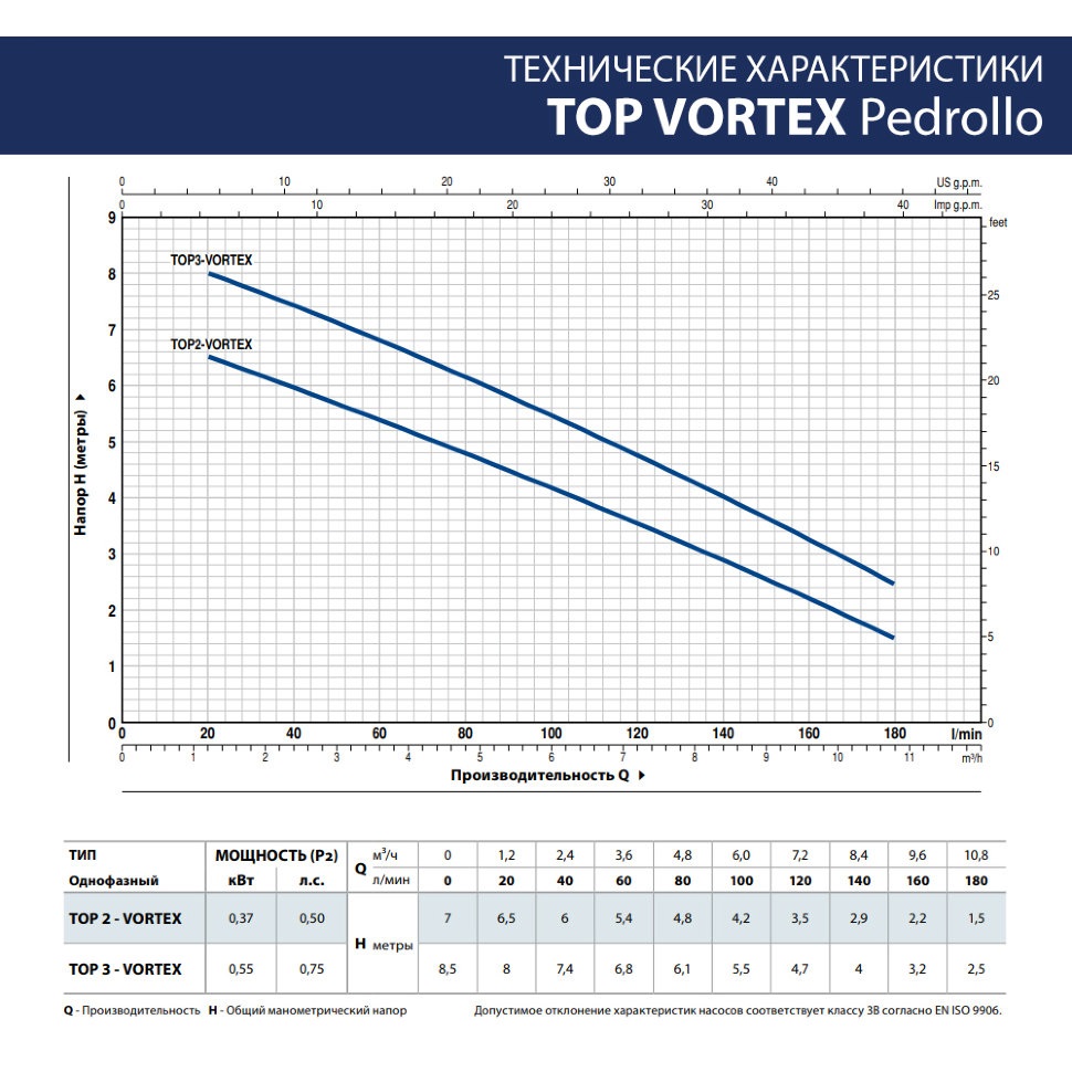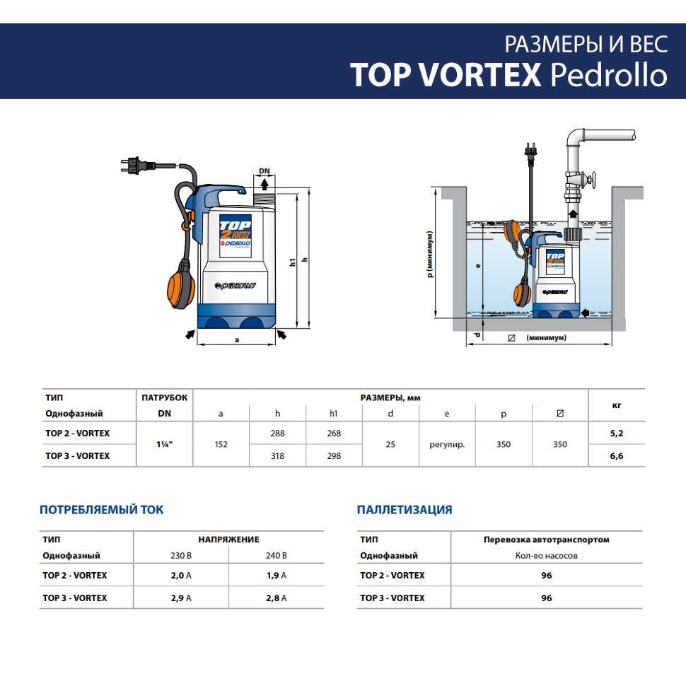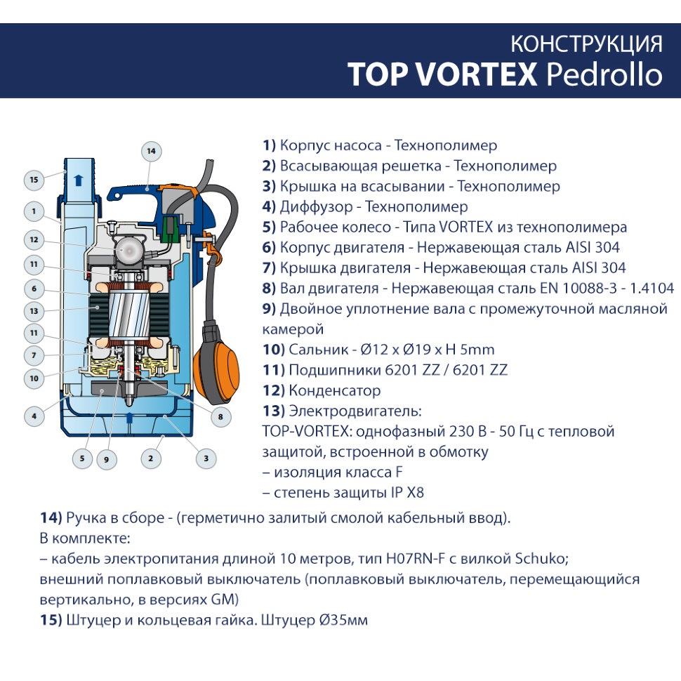 Погружной дренажный однофазный насос с попловком Pedrollo TOP 2 Vortex - Насосы TOP-VORTEX подходят для дренажа загрязненной воды, химически неагрессивной по отношению к конструкционным материалам насоса. Применённые конструктивные решения обеспечивают простоту в эксплуатации и безопасность функционирования насоса, благодаря полному охлаждению двигателя и двойному механическому уплотнению вала. Рекомендуются для хозяйственно-бытового применения, отвода загрязнённой воды, опорожнения бассейнов, отвода бытовых стоков, опорожнения накопительных колодцев, даже при присутствии в взвеси твердых частиц размером до Ø 20 мм.