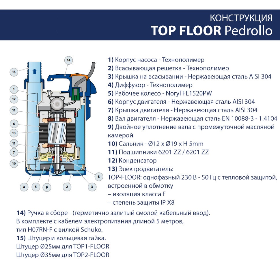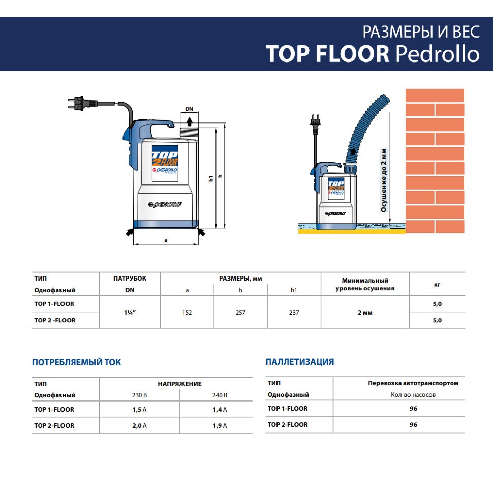 Погружной дренажный однофазный насос без попловка Pedrollo TOP Floor-2 M. Серия TOP-FLOOR подходит для дренажа чистой, без абразивных частиц, воды. Насосы могут откачивать воду до уровня 2 мм, поэтому они предназначены для использования в быту с целью экстренного осушения небольших затопленных помещений, во всех случаях, когда необходима максимальная степень осушения.
