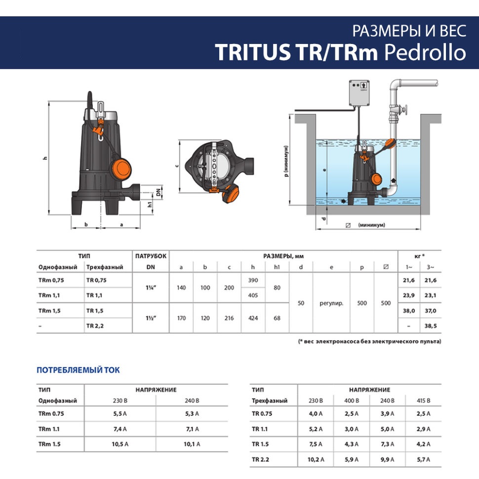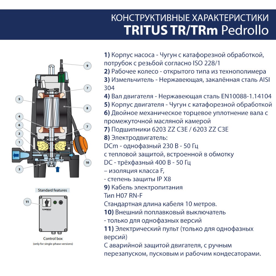 Погружной фекальный однофазный электронасос Pedrollo TRITUS TRm 1.5 M. Насосы серии TRITUS с измельчителем, изготовленные из толстостенного чугуна, характеризующегося высокой прочностью, стойкостью к абразивному воздействию и долговечностью. Насосы оснащены ИЗМЕЛЬЧИТЕЛЕМ из закалённой нержавеющей стали, что позволяет измельчать твёрдые частицы и волокна, содержащиеся в сточных водах бытового и коммунального секторов, для последующего перекачивания под давлением в канализационной системе по трубам малого диаметра.
