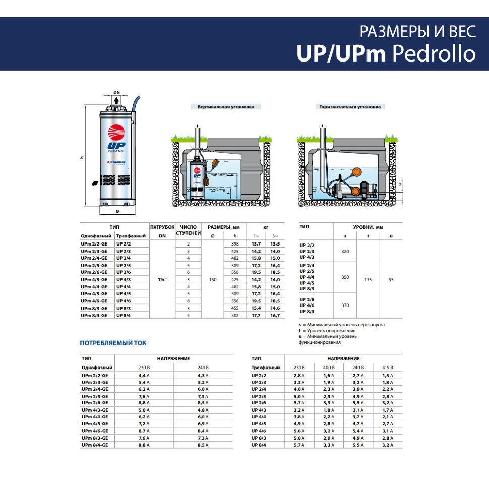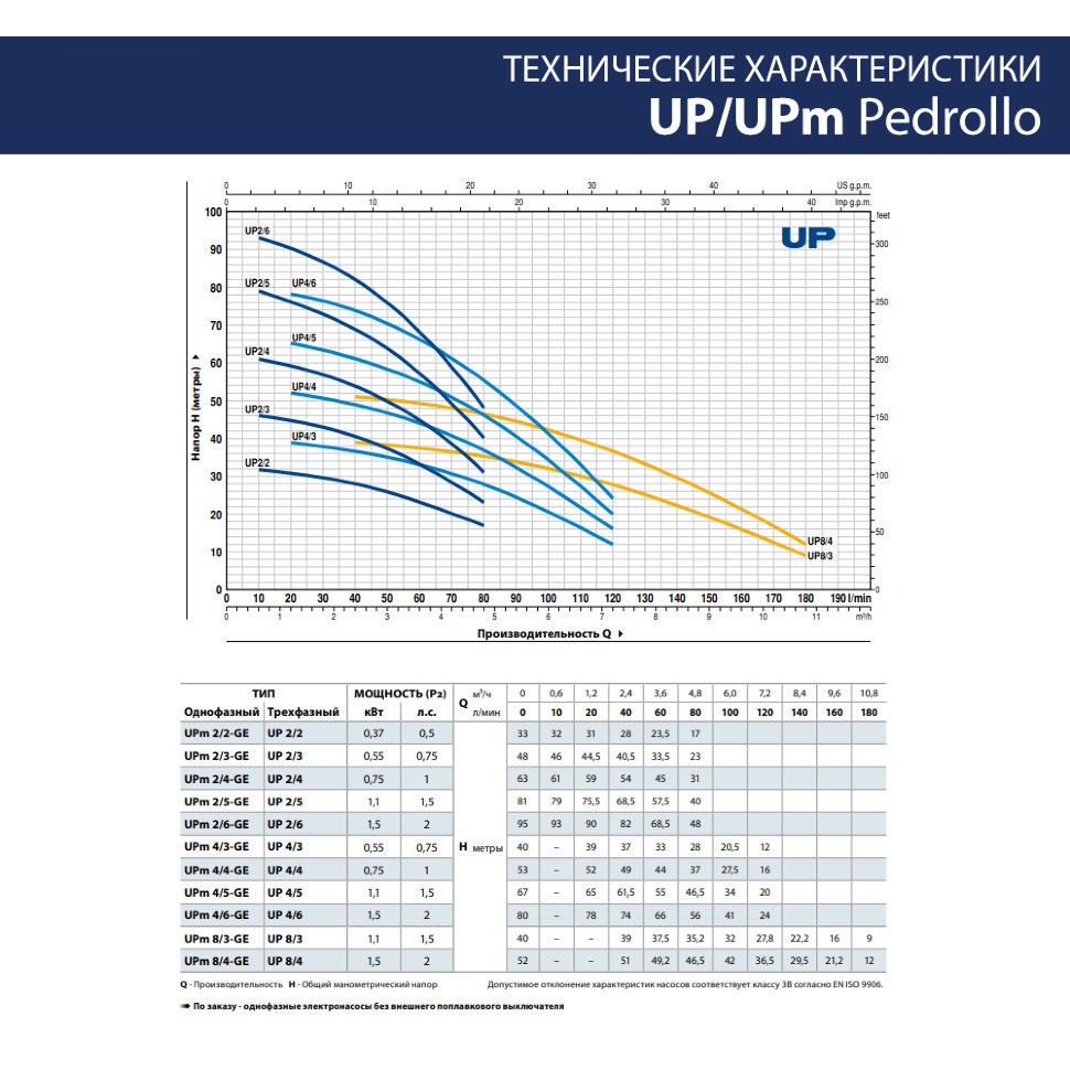 Многоступенчатые насосы однофазный насос Pedrollo UPm2/4- GE с попловком предназначены для подъёма воды из колодцев. Это отличное решение для бытовых нужд, которое позволит организовать бесперебойное водоснабжение загородного дома или дачи. Данные насосы способны работать даже при содержании песка в воде до 150 г/м3. Конструкция насоса обеспечивает защиту от засорения даже после длительного простоя. Оборудование серии UP выполнено из нержавеющей стали высокого качества, что обеспечивает надёжность, гидроизоляцию и долговечность аппаратуры. Кабель электропитания изготовлен из материалов, пригодных для использования в контакте с питьевой водой. Однофазные модели оборудованы поплавковым устройством выключения, защищающим насос от сухого хода.
