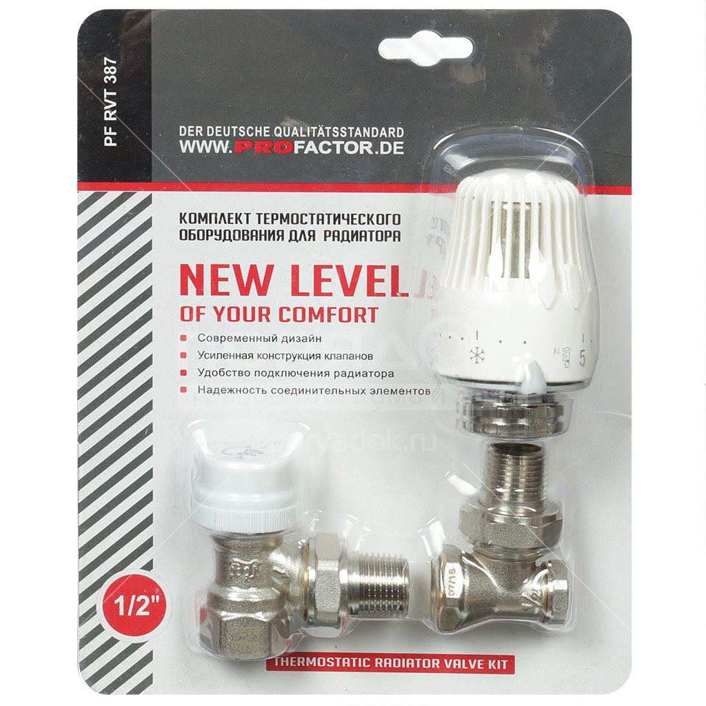 Комплект радиатора термостатический 1/2 угловой ProFactor PF RVT 387 - Комплекты термостатического оборудования служат для подключения отопительных приборов и регулирования расхода теплоносителя через них в однотрубных и двухтрубных системах отопления. Состав: клапан термостатический угловой PF RVT 382, клапан настроечный угловой PF RVA 378, головка термостатическая PF RVT 384