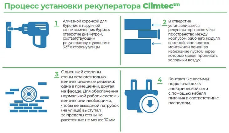 Рекуператор имеет единый модуль полностью готовый к установке. Рекуператор монтируется в верхней части стены, граничащей с улицей. Для этого необходимо сделать сквозное отверстие на улицу соответствующего диаметра. Диаметры отверстий разные, в зависимости от модели. В отверстие в стене на монтажную пену или другой уплотнитель устанавливается рабочий модуль рекуператора. Таким образом, весь рабочий модуль находится в толщине стены, а снаружи остаются только вентиляционные решетки: одна внутри помещения, другая на фасаде. Сквозное отверстие делается под наклоном 3-5 градусов в сторону улицы, чтобы дать возможность конденсату вытекать из теплообменника. Для обеспечения нормальной работы системы вентиляции необходимо, чтобы её воздухозаборный патрубок (со стороны улицы) выступал от стены не менее, чем на 5 мм.