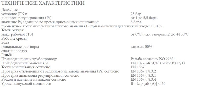 Редуктор давления ПОРШНЕВОГО ТИПА PN 25 с ввертными фитингами с наружной резьбой представляет собой автоматический клапан, снижающий и стабилизирующий давление среды внутри распределительного трубопровода с учетом предварительно заданного значения. Применение этого гидравлического устройства необходимо, если максимально возможное давление в любой точке системы водоснабжения может достигнуть или превысить условное давление, а также в том случае, когда к трубопроводу присоединены аппаратура или устройства, которые могут быть задействованы только при более низком давлении. Редуктор давления поршневого типа может применяться в системах водоснабжения как снаружи, так и внутри тех зданий, в которых максимальное давление воды в главном водопроводе не превышает 25 бар. Конструкция внутреннего поршня из термопластика обеспечивает жесткость, прочность и высокую точность регулировки благодаря компенсационному седлу. О-образные уплотнительные кольца из технического СКЭП perox, устойчивого к прилипанию и способствующего скольжению, с низким коэффициентом статического трения, обеспечивают устойчивость к износу и ограничивают потребность в техническом обслуживании.