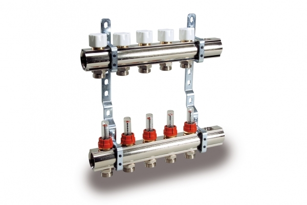 Коллектор с расходомерами Vision с 5 выходами EUROCON+1 на 3/4" и с дебитметром на 1" предназначен для систем отопления теплого пола. Коллекторная группа - распределитель с предварительно собранными расходомерами из никелированной латуни.