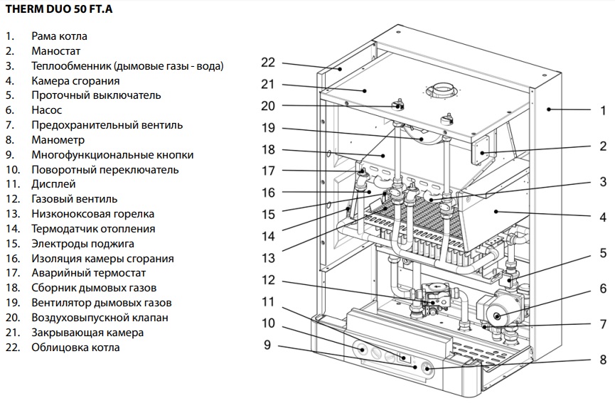 Therm DUO 50 это дымоходный настенный газовый котел мощностью 50 кВт, с возможностью подключения в каскад, для отопления дома общей площадью до 500 м2.