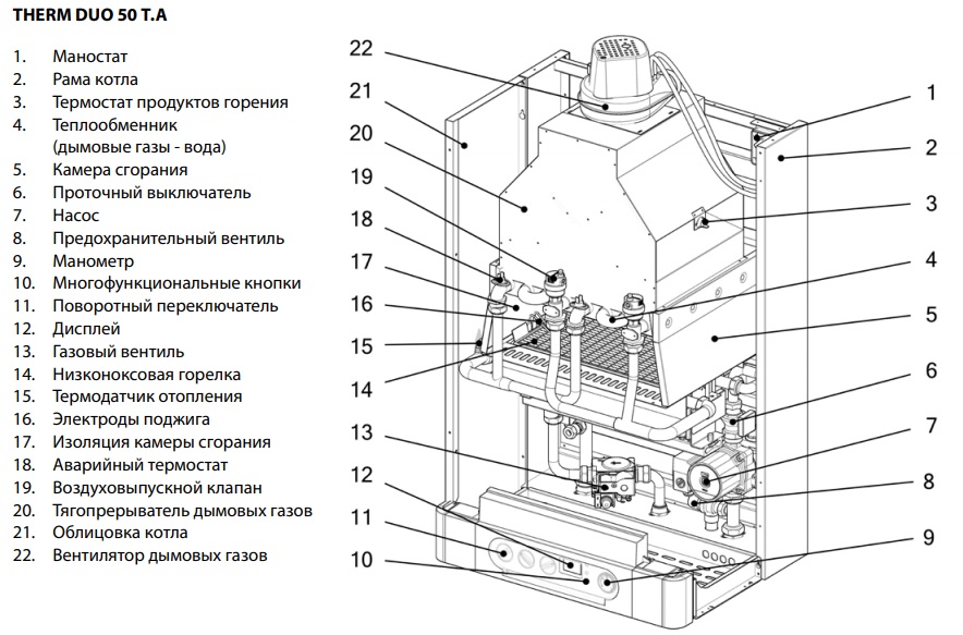 Therm DUO 50 это дымоходный настенный газовый котел мощностью 50 кВт, с возможностью подключения в каскад, для отопления дома общей площадью до 500 м2.