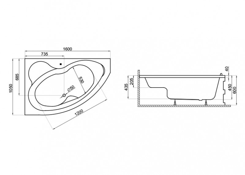 Угловая Акриловая ванна MEGA 1600*1050 мм L Угловая Акриловая ванна MEGA 1600*1050 мм L