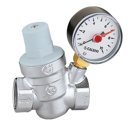 Редуктор давления с манометром CALEFFI PN 25 - 1" Редукционный клапан давления с моноблочным сменным картриджем, с манометром. Редукционные клапаны давления являются устройствами, которые, будучи установленными в частную сеть водоснабжения, снижают и стабилизируют давление на входе городской сети, которое обычно оказывается слишком высоким и изменяющимся для правильного использования на бытовых системах.