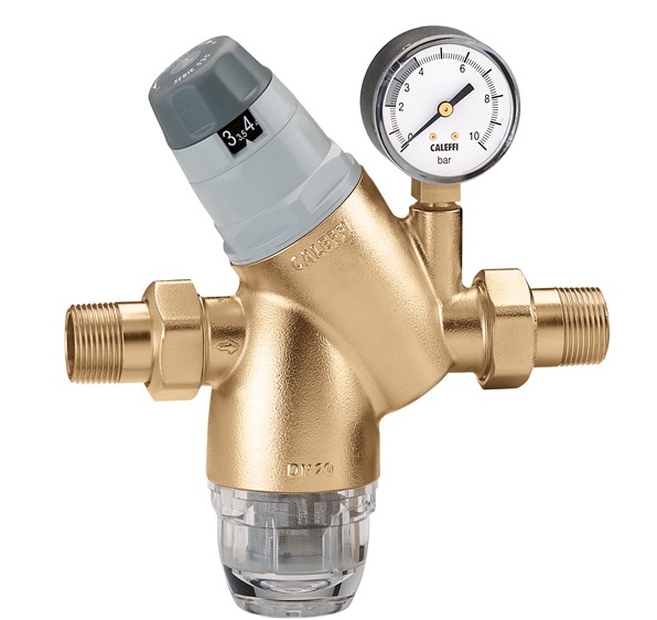 Редуктор давления с манометром CALEFFI PN 25 - 3/4" Редукционный клапан давления с моноблочным сменным картриджем, с манометром. Редукционные клапаны давления являются устройствами, которые, будучи установленными в частную сеть водоснабжения, снижают и стабилизируют давление на входе городской сети, которое обычно оказывается слишком высоким и изменяющимся для правильного использования на бытовых системах.