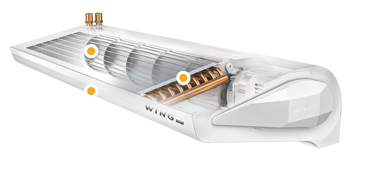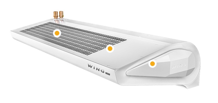 Минималистичная форма корпуса воздушной завесы WING, вдохновленная формой крыла планера, и элементы корпуса в форме граней бриллианта придают завесе неповторимую гармонию и элегантность. Энергоэффективный двигатель, производительный вентилятор и двухрядный нагреватель обеспечивают низкий уровень шума и максимальную эффективность устройства.