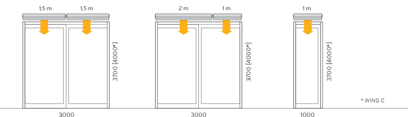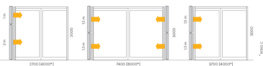 Воздушная завеса WING доступна в трех типоразмерах - 1 м, 1,5 м, 2 м. Завесы можно группировать друг с другом в различных вариантах, что позволяет надежно защитить любые входы здания.
