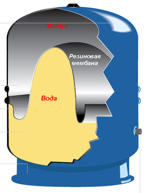 Внутри расширительного бака стоит резиновая мембрана, которая разделяет бак на две камеры: в одну камеру накачивают воздух, а другая камера остается пустой. В пустую камеру после установки и запуска отопления, начнется поступления теплоносителя. В другой камере, где накачен воздух, будет восстанавливаться необходимый объем. Когда жидкость охлаждается, то она вытесняется обратно в систему водоснабжения. Таким образом, в трубах держится постоянный, необходимый напор, именно поэтому система работает всегда стабильно, отсутствуют перегрузки и скачки давления.